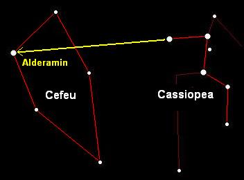 Una altra manera de trobar CEFEU es alineant les estrelles Schedar i Caph de CASSIOPEA (l'extrem dret de la W). Això ens porta directament a Alderamin, l'estrella més brillant de CEFEU.