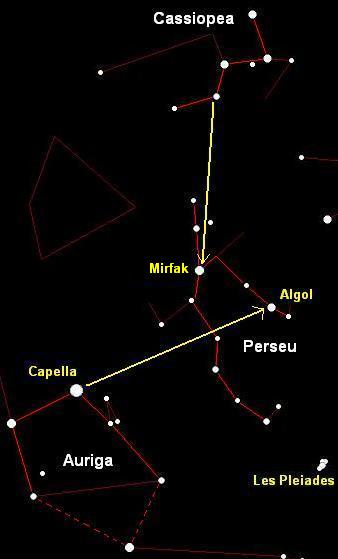 AURIGA també us pot conduir fins a PERSEU. Alineant les dues estrelles més brillants (Menkalinan i Capella) arribareu fins a Algol, una binària eclipsant també coneguda com "L'estrella del dimoni".